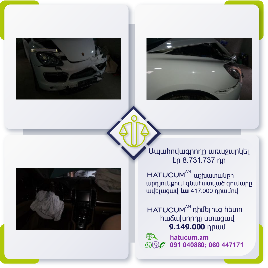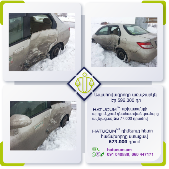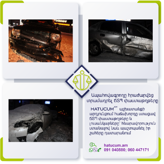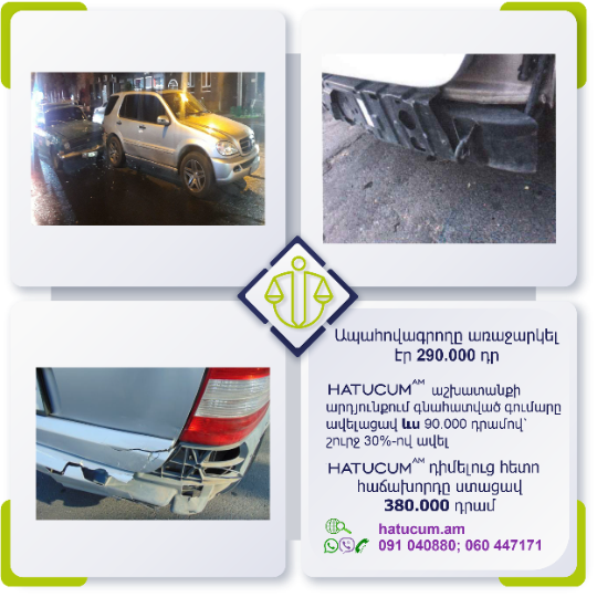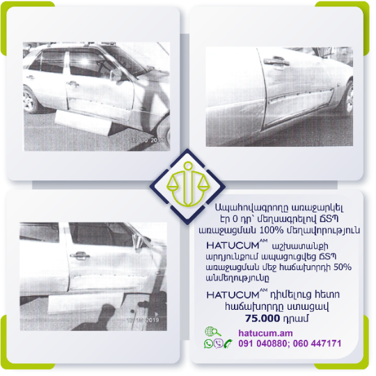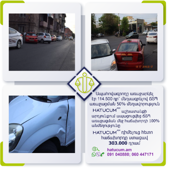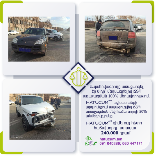 Ճանապարհատրանսպորտային պատահարի (ՃՏՊ) անկանխատեսելի հետևանքներից մշտապես ապահովագրված լինելու համար առաջարկում ենք Ձեզ արտադատական բողոքարկման բոլոր գործառույթների մեկ տարվա Hatucum.am–ի մասնագիտական պաշտպանությունը փաթեթով, հարմարավետ արժեքով՝ ընդամենը տարեկան 14500 դրամով:
