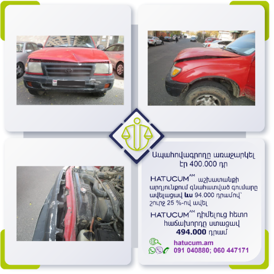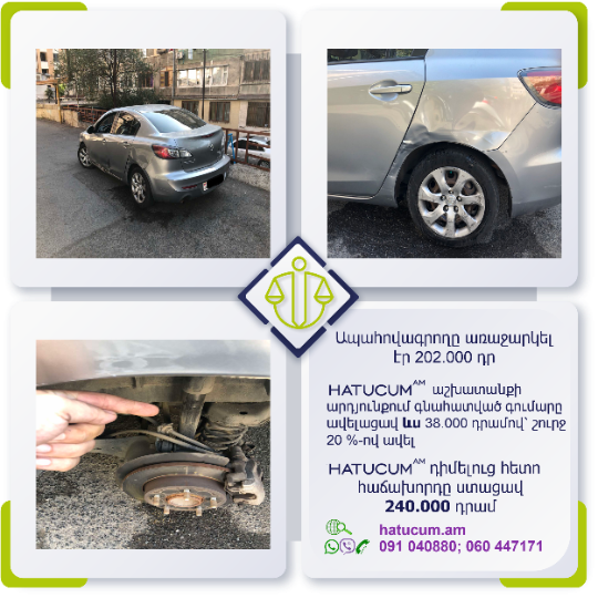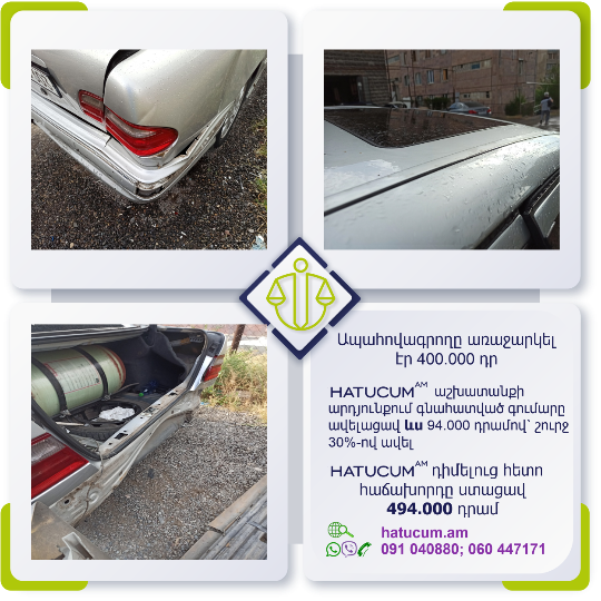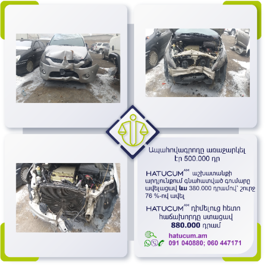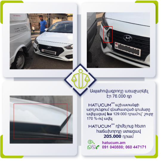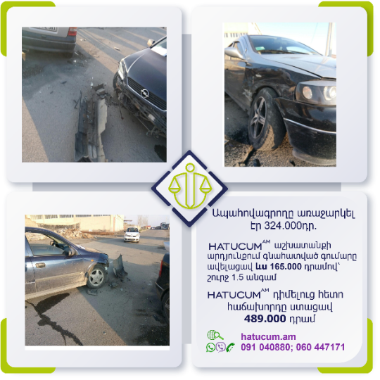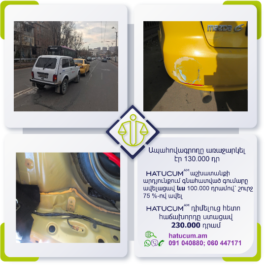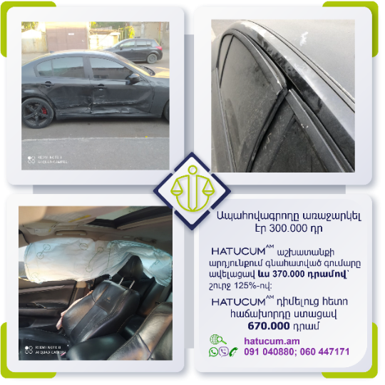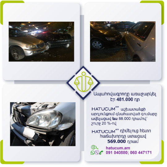 Այս վայրկյանից Դուք կունենաք Hatucum.am–ի մասնագետների պաշտպանությունը, որոնք հմուտ կառավարելու են Ձեր պահանջի գործը, իսկ Դուք ընդամենը սպասելու եք հատուցման վերաբերյալ նորությունները և լրավճարի ստացման մասին տեղեկատվությունը: